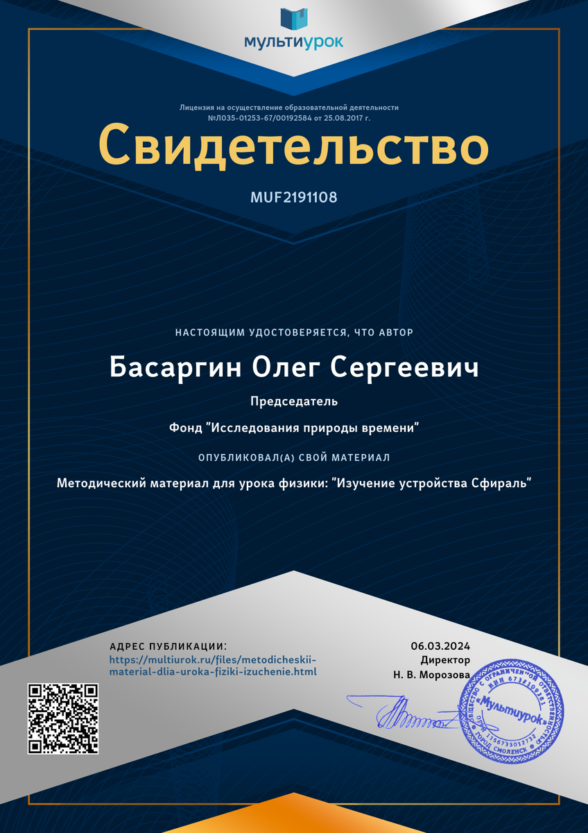 Методический материал для урока физики: "Изучение устройства Сфираль"