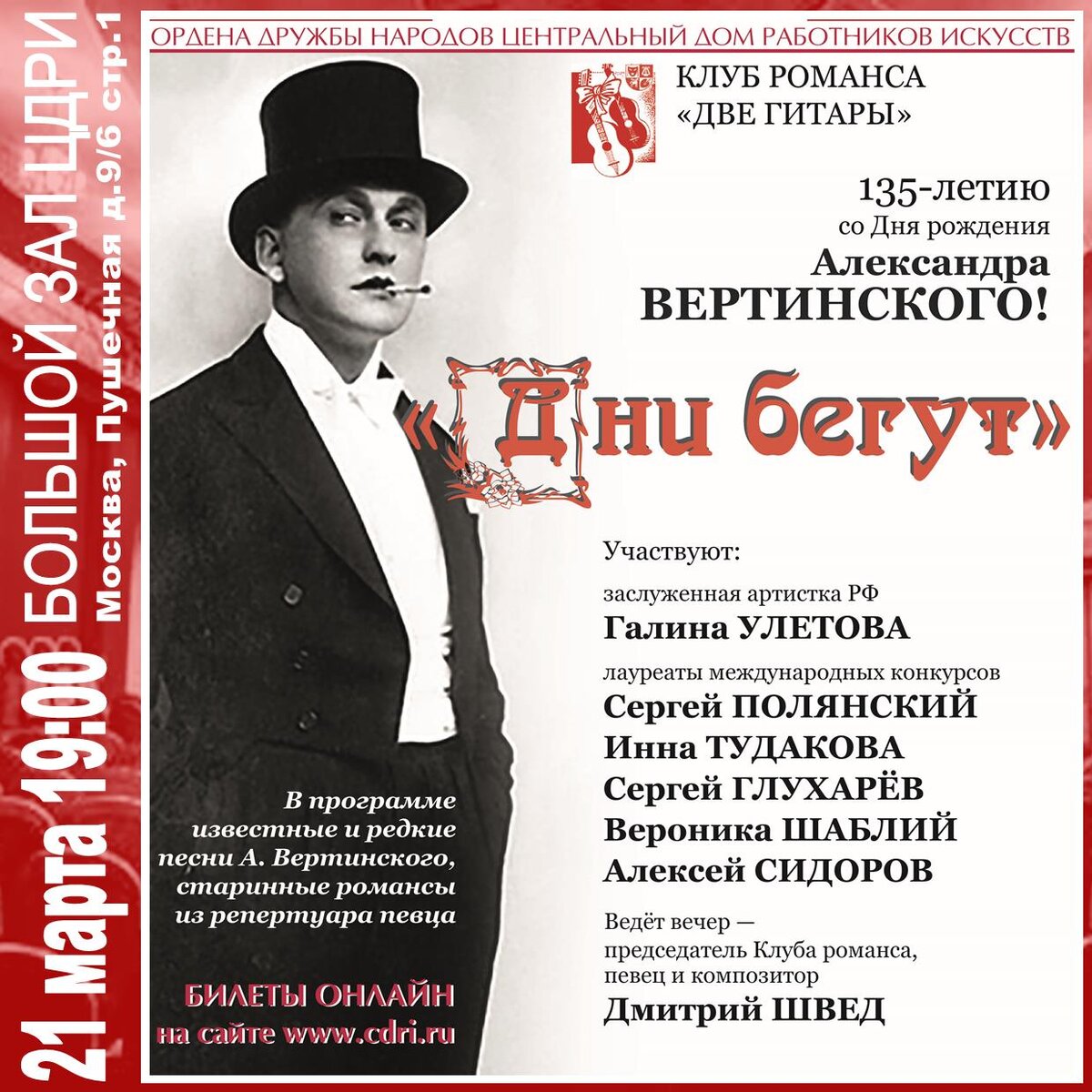 «Дни бегут!» — концерт к 135-летию со дня рождения А. Вертинского В программе известные и редкие песни, старинные романсы из репертуара Александра Вертинского исполнят: