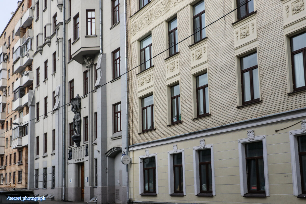 Однако и здесь я снова испытал свою извечную боль: переулок такой узкий, что сфотографировать дом целиком ну никак не получается. Поэтому много кадров делалось сбоку, от соседних зданий на противоположной стороне. Вы уж простите меня за это (5 фото).