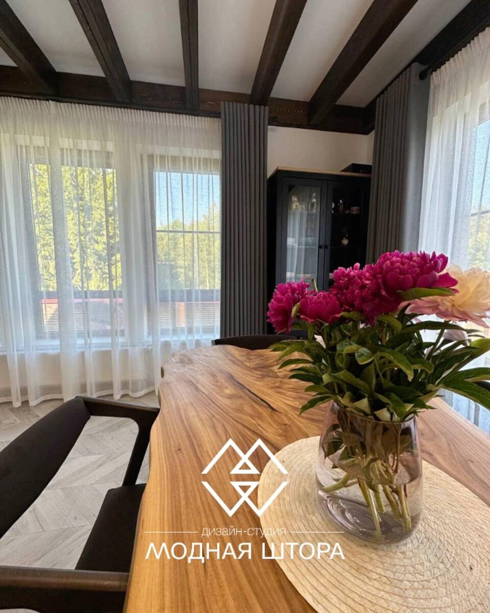 Изначально на этом объекте мы планировали совместить портьеры и римские шторы, но в итоге выбрали классический тюль!