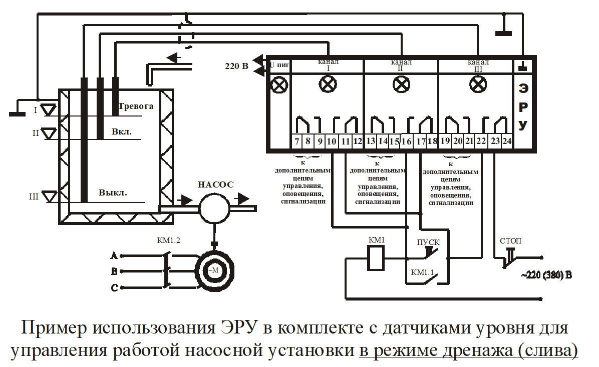 Для подключения реле уровня жидкости в режиме дренажа (слива), потребуется подключить реле уровня жидкости (рассматривается ЭРУ-3-5СК), согласно электрической схеме, убедиться, что электроды датчиков правильно погружены в жидкость и подключены к схеме. ОПИСАНИЕ РАБОТЫ СХЕМЫ: 1. Схема позволяет автоматизировать работу насосной установки в режиме дренажа (слива) с отключением электродвигателя насоса при понижении уровня жидкости в наполняемой емкости до нижнего порогового уровня (”Выкл”) и включением насоса при повышении уровня жидкости в емкости до верхнего порогового уровня (”Вкл”). 2. Положение выходных контактов ЭРУ, показанное на схеме, соответствует “сухому” ( не погруженному в жидкость) состоянию датчиков уровня при включенном электропитании ЭРУ. 3. Данная схема предполагает, что корпус резервуара для жидкости выполнен из электропроводного материала. В противном случае необходимо введение в резервуар на глубину не менее датчика нижнего уровня