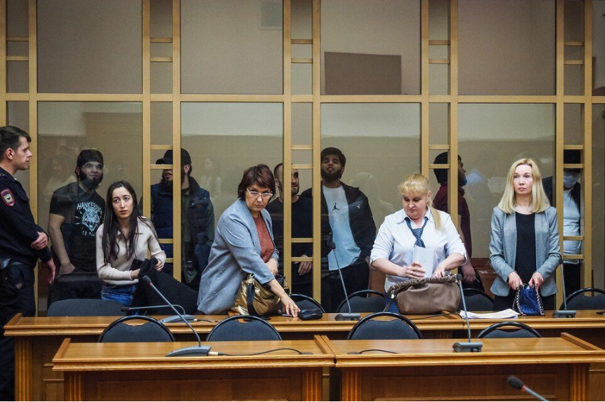На скамье подсудимых - семеро таджиков, обвинены в хулиганстве и убийстве. Гражданство РФ только у одного. Мигранты плохо говорят по-русски, пользуются переводчиками. Хотя до этого много лет жили в России. А двое братьев, основных фигурантов дела Тоир и Зоир даже учились в колледже на полицейских. Как они учились без переводчика, интересно.