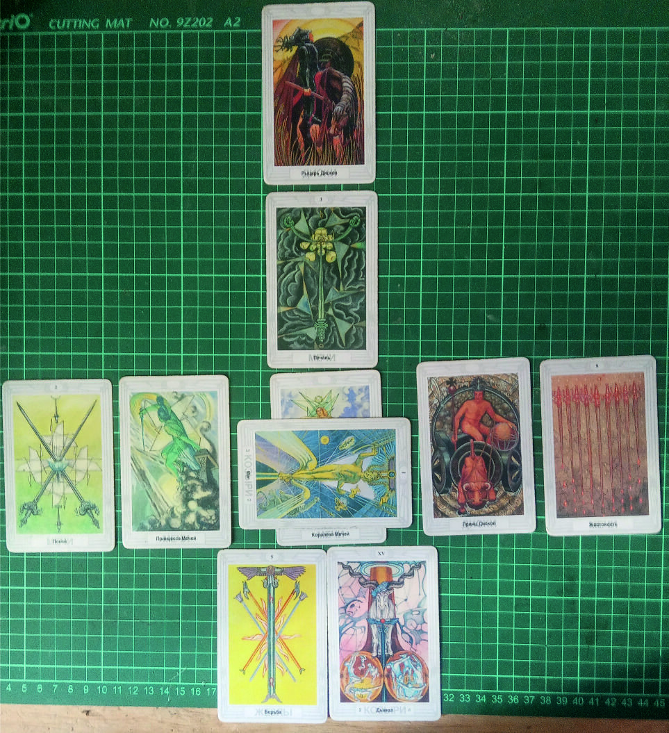 Здравствуйте. Вопрос, кто виноват, передо мной давно не стоит, но, как-то определить причины и следствия происходящего вокруг всё же хочется. Положительными, и не очень, результатами этих поисков я с Вами делюсь. В принципе, расклады таро этим мне и нравятся, что порядок вещей в них определяется практически сразу. В противном случае этот расклад я бы не выложил на Ваше усмотрение. Если честно, то он меня даже испугал. Но, привыкнув, рассуждать что всё происходит ради последующего за ним, знакомлю Вас с раскладом. Сразу бросаются в глаза дикое количество мечей и сопутствующий им дьявол в основе расклада. Начну с мечей. Здесь вестник болезни. Хотя, исходя из чистой нумерологии, 9 мечей можно трактовать как полноту мыслей. Согласен с Вероникой, изображение здесь не даёт соврать, это полнота проблем. Вам не кажется, что сегодняшний момент по колориту больше похож на прошлое? Сами посмотрите. Почему этот волшебник весь светится холодом? Или он просто грань? Или мы с Вами слишком узко см