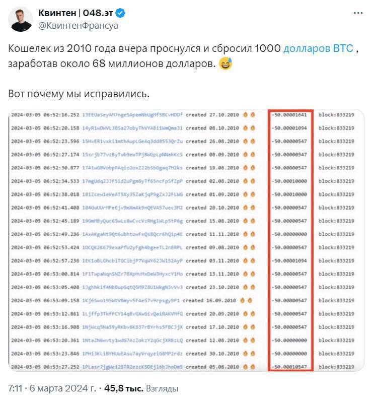 Неизвестный пользователь продал добытые в 2010 году 1000 BTC и заработал $68 млн. Удивительно, что в то время он покупал Bitcoin всего за $0,28. Продажу своих BTC он провел 5 марта, когда его цена пробила новый исторический максимум. Это ещё один пример того, как умение ждать может вам окупиться в миллионы раз.