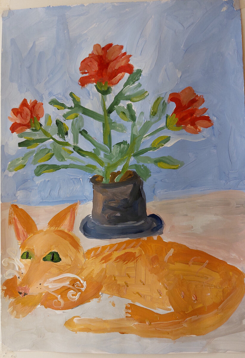 Сегодня на занятии по живописи Миша дорисовал букет маме на 8 марта. И куда ж мы без кота))) Следующая работа будет принимать участие в конкурсе, в Подольском краеведческом музее. Картина называется " Моя семья". Начало положено. Миша в центре, я и муж по бокам, мы отмечаем день рождения. Кот пытается стянуть что-то со стола. Даша, поскольку не живет с нами, изображена сбоку, в кресле. И Дашина кошка тоже у нас в гостях. Перед больницей есть немного времени, и человек рисует новую картину по номерам.