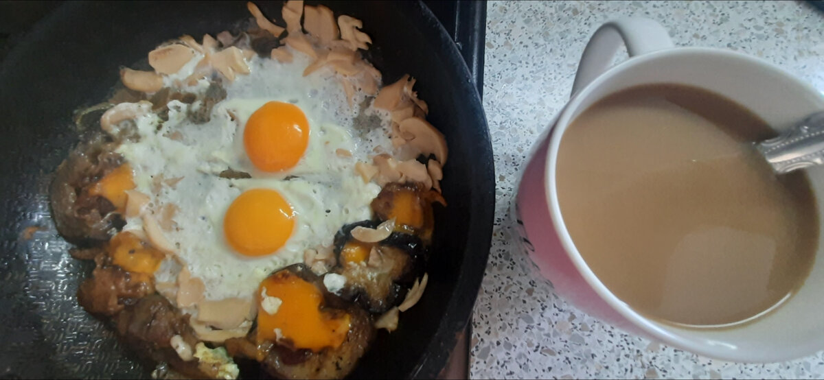 Яичница, баклажаны с сыром, шампиньоны. (После дня рождения дочки, осталось много вкусностей, подьедаем).