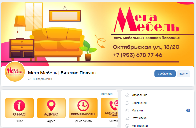 О проекте: Мега Мебель — сеть магазинов Поволжья, представленная и в г. Вятские Поляны. Совершив переезд на новый адрес, собственники бизнеса решили поддержать перемены и оформить в новом стиле социальные сети, вдохновились на регулярный постинг. Задача: Проведение ребрендинга в социальных сетях, оформление и заполнение группы понятной и удобно воспринимаемой информацией о магазине. Пожелание заказчика: сохранить корпоративную цветовую гамму в виде сочетания желтого и красных цветов. Ребрендинг: В процессе работы мы выявили для себя минимальный и необходимый пакет оформления группы ВКонтакте: - обложка сообщества (декстоп и мобильная версии) - обложки меню - простой и считываемый аватар Рассмотрим эти термины подробнее, изучим «мат.часть», так сказать) Баннер. Первое, что стоит сделать в сообществе – баннер, или шапку группы. Большая яркая картинка привлечет внимание пользователя и будет источником самой важной информации о вас. Размеры различаются для десктопной и мобильной версии: 15