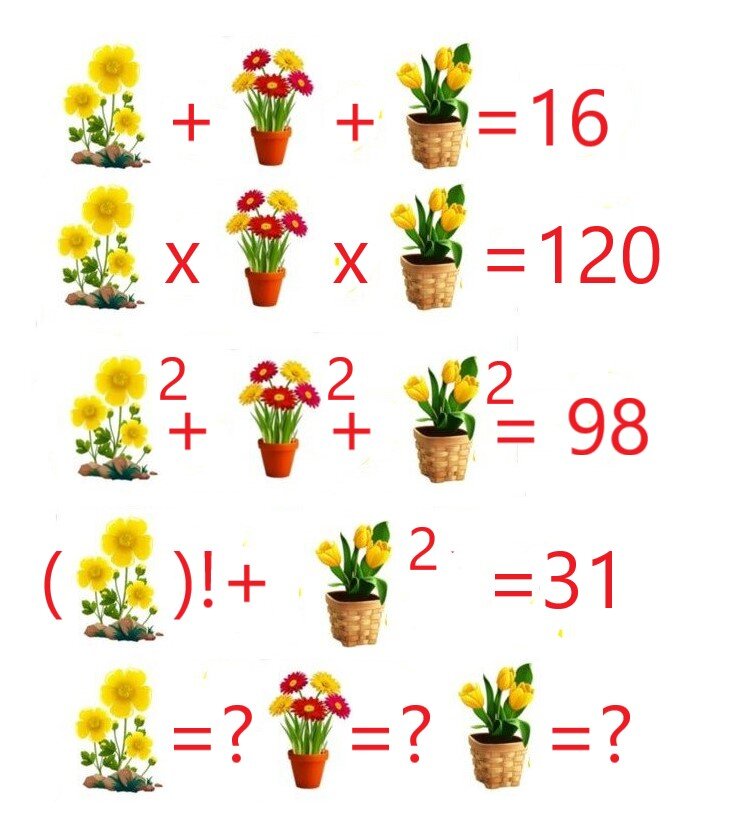 Приветствую вас, дорогие читатели и читательницы! Прежде всего хочу поздравить наших прекрасных дам со светлым весенним праздником и пожелать здоровья, счастья, любви и побольше цветов! Головоломка моя сегодня будет тоже "цветочная". Проанализируйте первые четыре строчки задания и найдите значение выражений в четвертой строке. Если вы нашли ответ, поделитесь им в комментариях. Можно представить и само решение. Подписывайтесь на канал и не забудьте поставить лайк) Спасибо за внимание!