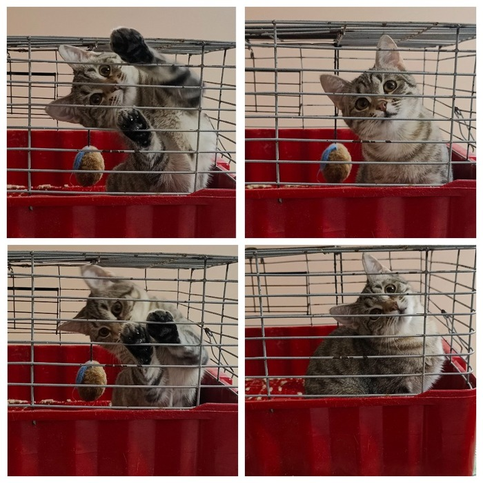 Была подкинута в клинику. К сожалению, история ее неизвестна. Сначала она очень шипела и ругалась. Сейчас почти полностью оттаяла, но пока не ясно, как она будет вести себя вне клетки. Пойдет ли на руки? И нужно ли будет ждать, пока она опять доверится человеку. Очень прошу обратить на нее внимание. Возможно, кто-то захочет взять вот такую вот ласковую и любопытную полосатку. Ей чуть больше 4 месяцев. Зубы уже сменились. Вчера, когда я была на приеме с котами, давала мне смело свою лапку.