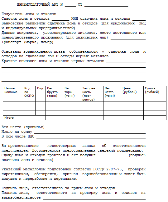 Это документы на металлолом для частных лиц. Юридические лица составляют собственный пакет документов об оприходовании, списании лома, готовят бухгалтерскую отчетность.