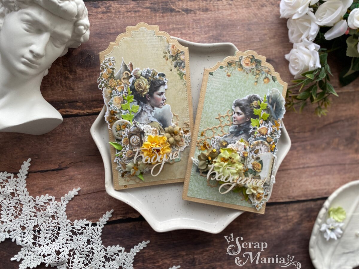 Для своих открыток я выбрала коллекцию "Затерянная среди роз" с оттенками желтого и зеленого. Композиция открыток составлена в зеркальном отражении примерно с одинаковым расположением обязательных элементов, на данном этапе это что-то вязаное и вырубка.
