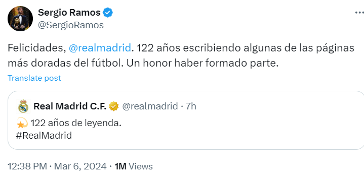 «Королевский клуб» отмечает 122-летие – 6 марта 1902 года был избран первый совет директоров «Мадрида». Легенды «Реала» поздравили «сливочных» с праздником. Серхио Рамос: «Поздравляю, «Мадрид». За 122 года вы написали несколько самых блистательных страниц в истории футбола. Горд быть частью этого». Пепе: «122 года истории! Поздравляю, «Мадрид». Криштиану Роналду: «Поздравляю с этими 122 годами истории, семья Мадридистов! Hala Madrid!» Марсело: «Поздравляю, мой «Мадрид». 122 года легенде. Невероятное счастье быть мадридистой». Икер Касильяс: «С днем рождения, «Мадрид»! 122 года!» Роналдо Назарио: «122 года! Поздравляю, «Мадрид»!» Кака: «122 года славы». Каземиро: «История, которую ты написал, история, которую еще предстоит написать... 122 поздравления». Сами Хедира: «122 года страсти. Поздравляю, «Реал»! Hala Madrid!» А чего «Мадриду» в день рождения пожелаете вы?