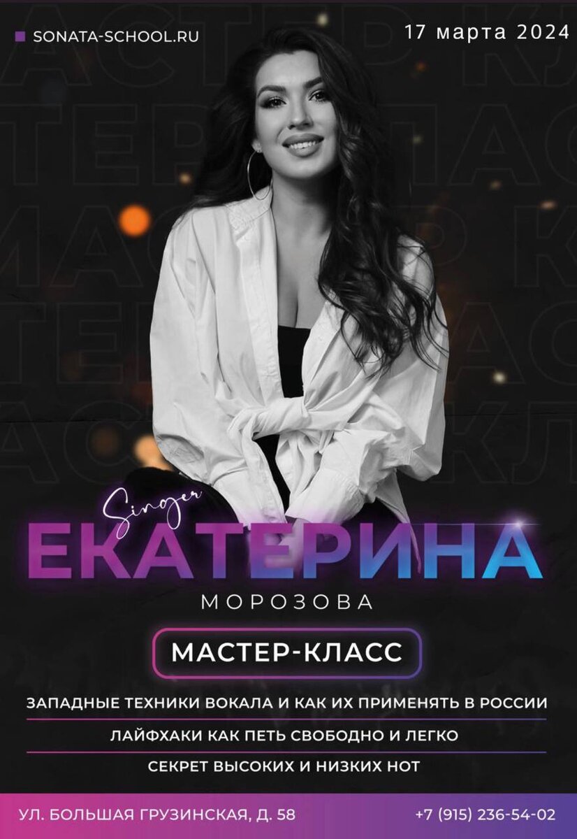 Вокальный мастер-класс 17.03 от Екатерины Морозовой ,певицы и звездного вокального наставника🌟 Хочешь петь свободно и легко❓ г. Москва | SONATA MUSIC SCHOOL Что вас ждёт на мастер классе: ☑️ Вы познакомитесь с современными эстрадными вокальными техниками ☑️Вы узнаете, что такое вокальные "зажимы" и как от них избавиться ☑️Вы рассмотрите вокальные приёмы на примерах российских и зарубежных исполнителей ☑️Вы сможете ознакомиться с авторскими упражнениями и получить обратную связь в ходе мастер класса (вокальный практикум) Программа мастер- класса разработана таким образом, что она будет актуальна для новичков или уже опытных вокалистов. Погрузитесь в мир профессиональной вокальной техники под руководством выдающегося педагога, Лауреата Международных конкурсов вокального искусства и одной из лучших выпускниц РАМ. Им Гнесиных. Дата:17/03, воскресенье 📍 Время: 14:00 Продолжительность мастер-класса :2 часа. Адрес: Большая Грузинская, 58 количество мест ограничено. Регистраци