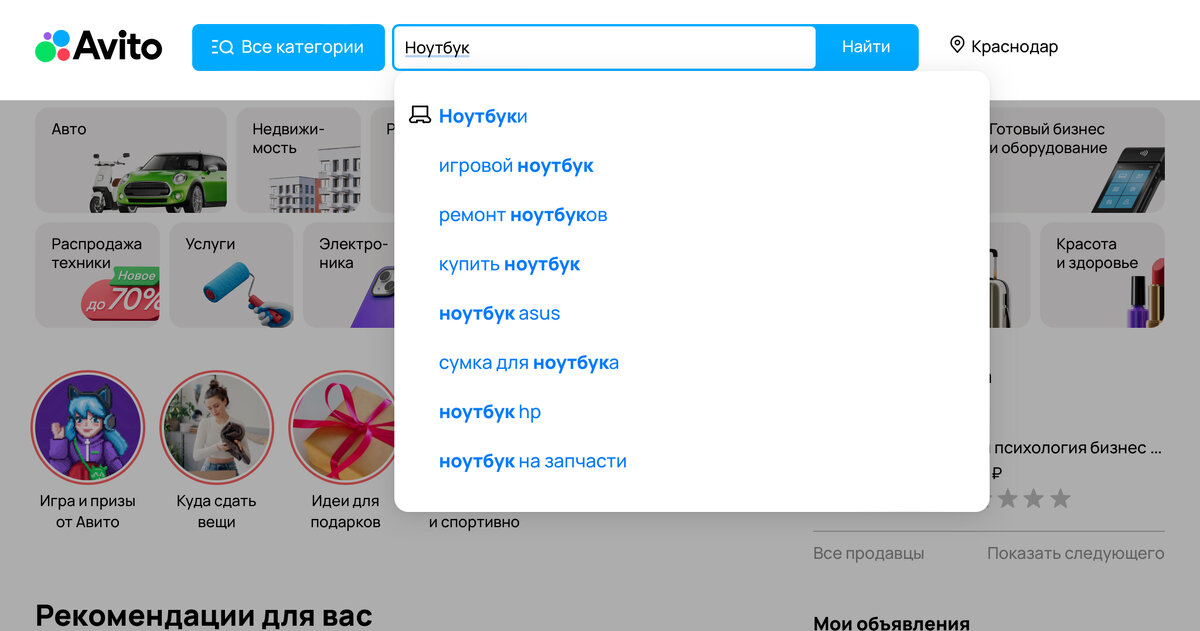 Еще один лайфхак, как проверить то, по какому запросу чаще всего ищут пользователи Авито. Возьмем к примеру широкий запрос «ноутбук»