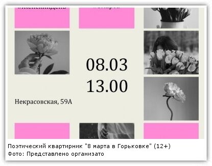 В Горьковке 8 марта ждут на небольшой поэтический квартирник, где можно прочитать стихи, посвященные женщинам. На мероприятии будут поздравлять прекрасных дам с Международным женским днём. Для того, чтобы прочитать свои или чужие стихи нужно записаться по тел.: +7(914) 079-79-58.