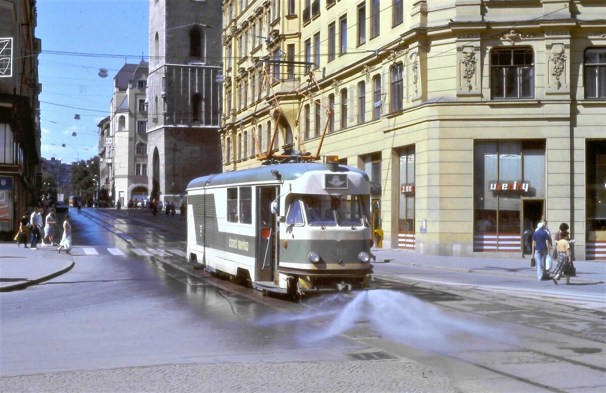 Поливомоечный трамвай Татра в работе в Чешском городе Брно