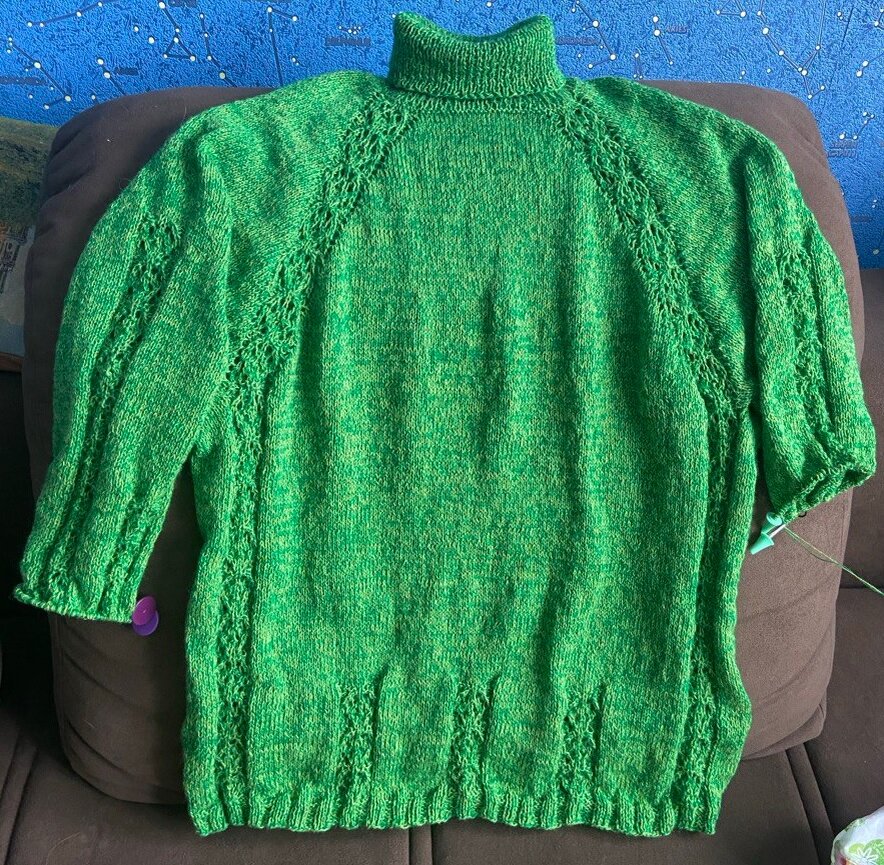 Обещала к 8 марта связать. Выполнено! Не обошлось без казусов, но в целом, всё прекрасно получилось. Этот свитер не тёплый. Но под курточку , конечно, будет утеплителем. Конструкция как всегда - от высокого воротника (с отворотом) регланом вниз. Новшества - в ажурных линиях. Ранее я "обрывала" ажурную линию реглана в подрезах, а в этот раз сделала по тушке вниз. В дополнение сделала на рукавах ажур от линии разделения и по низу три раппорта ажура связала. В окончании у меня неравномерная резинка: распределяла петли так, чтобы узор не нарушался. На фото выше "казус"... довязывая первый рукав , я засомневалась: хватит ли ниток (с бобины). Решила сначала сделать 3/4 рукав, а затем посмотреть по факту со второго рукава сколько будет оставаться. Оказалось, что даже довязать длину первого рукава на втором не получилось (три ряда не хватило...) Естественно, я рассчитывала - и по весу, и по рядам... но всё равно получилось, что не хватило. Поэтому манжетики довязаны в две нитки из клубков б/