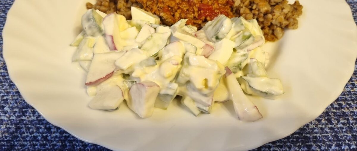 Ну вдруг вы про него забыли, а тут раз вспомните и сделаете. Тем более весна же уже где-то рядом)) И не важно, что -12 на улице и снег идет))) Итак, нам нужно: 2 яйца 1 огурец 5 редисок Так-то еще бы зелени лука и укропа. Сметана Все режем произвольно, солим, заправляем сметаной, наслаждаемся!