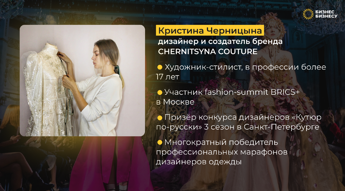Это было одним из ярких эпизодов профессиональной карьеры удмуртского дизайнера. Но этому предшествовал длинный путь: от первых уроков со швейной машинкой в сельской школе до эксклюзивных заказов за границей. Сейчас наряды Кристины Черницыной украшают обложки иностранных fashion-журналов и конкурсы красоты от Удмуртии до Лас-Вегаса. Специально для «Бизнес Бизнесу» она рассказала, как придумывает образы и чем вдохновляется.