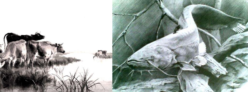 РАССКАЗ О ТОМ, КАКИЕ В СТАРИНУ, В РЕКЕ ДОН ВОДИЛИСЬ ОГРОМНЫХ РАЗМЕРОВ РЫБЫ. Это случилось перед тем, как затопили Цимлянское водохранилище. В то время проводилась очистка дна будущего - «моря». Вырубался в займище и вывозился лес, очищались площадки от зарослей. Пропадали богатейшие сенокосные угодья. Наш колхоз, хоть и степной, послал нас, человек 50, для заготовки хвороста и изготовления плетней. Из плетней были сделаны базы для коров и там располагался дойный гурт. Мы, двое скотников, пасли коров. Богатая, нетронутая трава была на острове и ее нужно было использовать для повышения надоев вплоть до затопления. Остров отделял ерик, и ежедневно коров вплавь переправляли на остров. Сначала коровы плавали охотно. Но раз-другой корова взмыкивала не своим голосом, скрывалась под водой, а затем скачками старалась выбраться. Коровы стали бояться плавать. Приходилось одному скотнику переплывать в лодке, а другому гнать с берега. Мы были в недоумении. Кто их хватает? То вымя ободрано, то хват