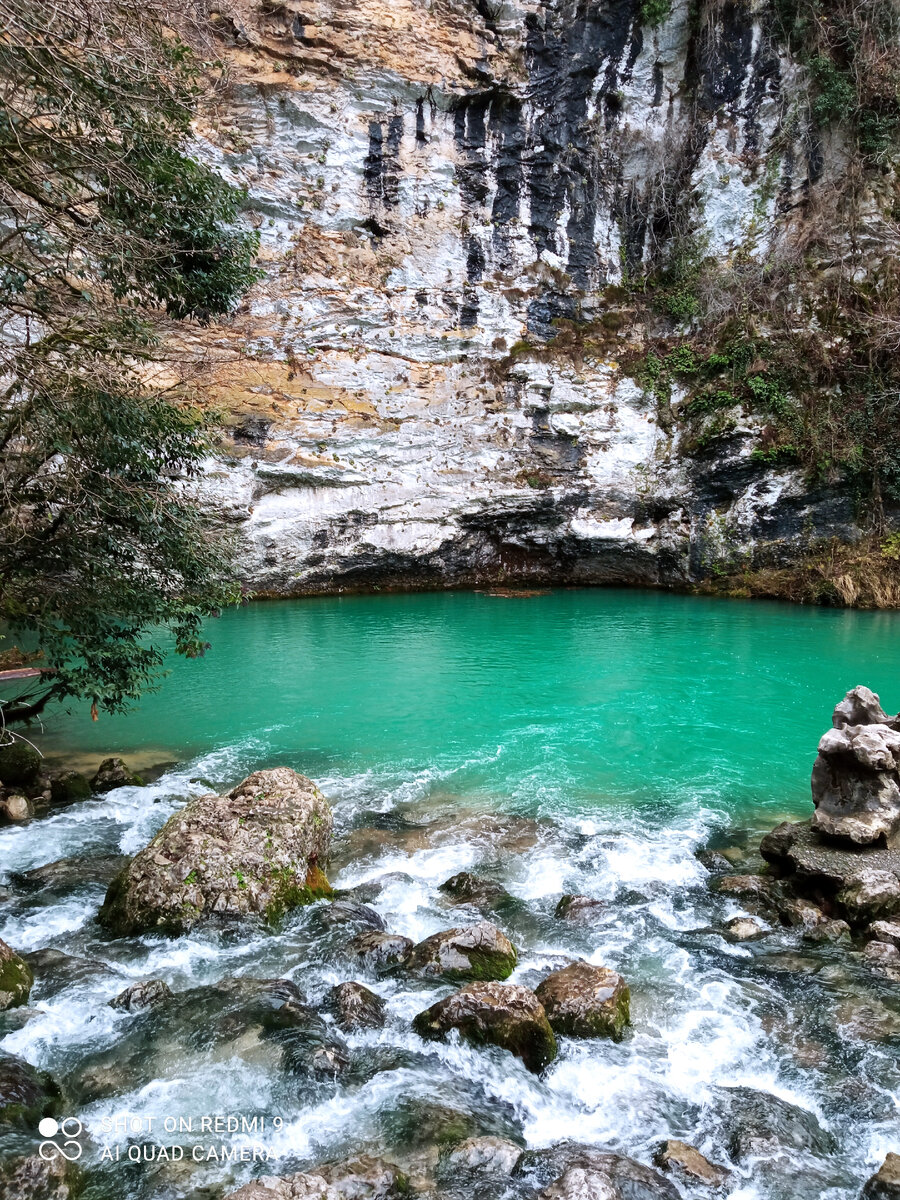 Ещё один яркий момент из однодневной экскурсии в Абхазии - это Голубое озеро . Оно расположено в горах по дороге на озеро Рица. Голубым его называют из-за цвета воды. Она нереально голубого цвета. И для привлечения туристов стоят небольшие скульптурные композиции . Вот такого необычного цвета вода в Голубом озере.