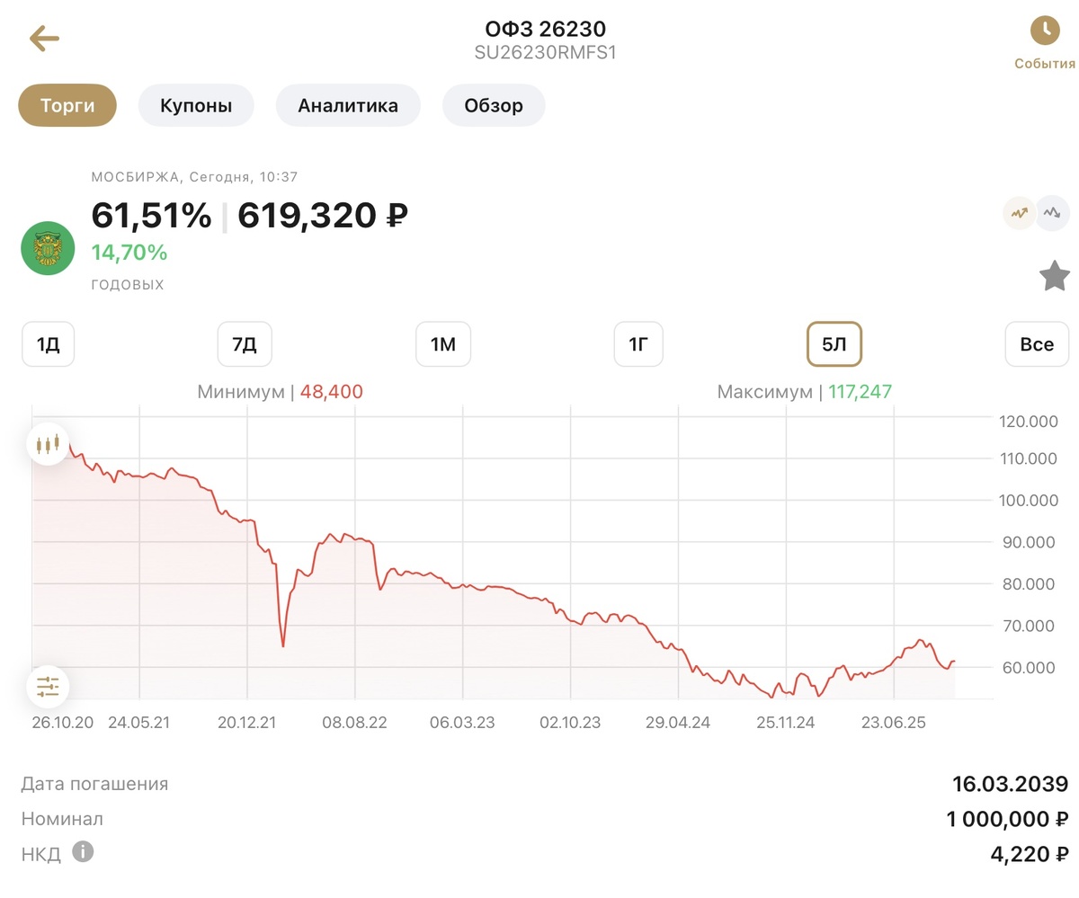 Длинная ОФЗ 26230 через полтора года после прогноза стоит все еще на 10% дешевле.