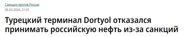 Справочно: Терминал Dortyol расположен в провинции Хатай на юге Турции и выполняет функцию нефтного хаба. В 2023 году экспорт с терминала увеличился в 5 раз по сравнению с 2021 годом, составив 24,7 млн баррелей (из них 11,74 млн баррелей были поставлены туда из России). Турция в 2023 году стала третьим по величине из крупнейших импортеров российской нефти. Частыми пунктами назначения нефти, экспортируемой из Dortyol, были греческие порты Коринф, Элефсис и Салоники, а также центры торговли, переработки и хранения нефти в Роттердаме и Антверпене.