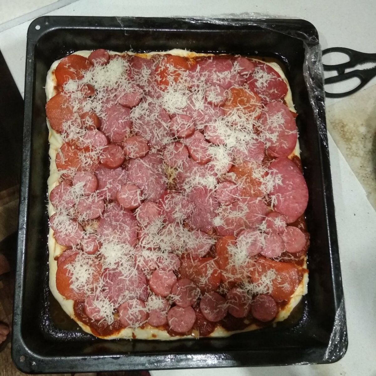 Приготовление: Мои заметки к рецепту: Если заменить пепперони на салями, пицца будет ближе к итальянской кухне. Также для уменьшения количества жира можно обжарить колбасу на сухой сковороде, потом выложить на бумажное полотенце, сложенное в несколько слоев. Кстати, на следующий день тесто у сицилийской пиццы будет гораздо вкуснее. Источник: