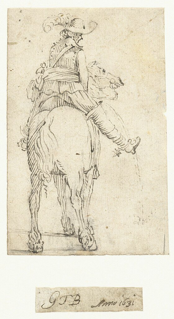 С самого начала своей карьеры художника Герард Терборх (1617-1681) был очарован взаимодействием лошади и всадника. В многочисленных рисунках времен своего становления в родном художнику Зволле он обращался к этой теме, изображая не только всадников на конях, но и кавалеров, поправляющих седла, и кучеров, погоняющих лошадей. В большинстве этих зарисовок, включая один запоминающийся рисунок, на котором изображен конный солдат, мочящийся, пока лошадь спокойно ждет, когда он закончит, фигуры показаны сзади — они анонимны и ничем не примечательны. Тем не менее, хотя такие исследования помогают создать контекст для «Коня и всадника», они мало что делают для подготовки зрителя к поразительной силе этой исключительной картины. Терборх представляет собой не героический образ кавалериста на могучем коне посреди битвы, а скорее слегка утомленную фигуру, сгорбившуюся над своим могучим конем, идущим по неопределенному ландшафту. Этот образ сразу же вызывает в воображении изоляцию и долгие, один