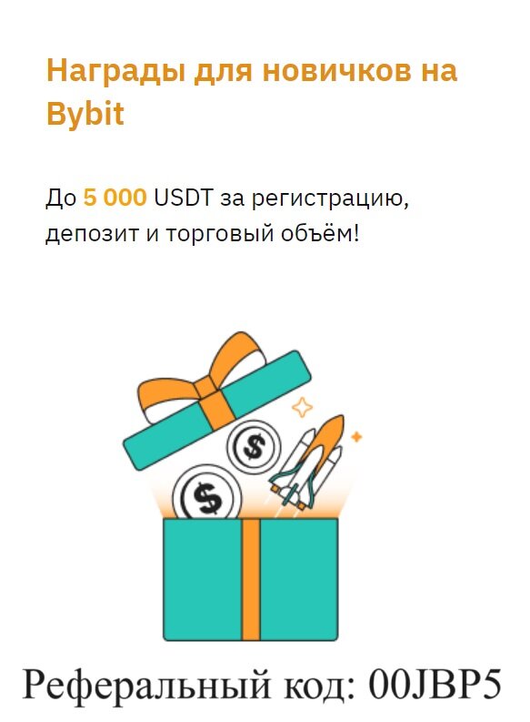 ByBit - биржа для покупки и продажи криптовалют, которая работает в России. Регистрация на криптобирже ByBit - реферальный код с бонусом до 5000$ Дополнительно получите бонус при регистрации до 5000 USDT указав реферальный код 00JBP5, либо просто перейдя по ссылке: https://www.bybit.com/invite?ref=00JBP5 Если переходите по ссылке указанной выше, то вводить реферальный код не нужно, он применяться автоматически. Регистрация происходит буквально в несколько кликов. Способы регистрации на выбор: Как купить криптовалюту на бирже ByBit? В первую очередь необходимо пополнить баланс криптобиржи (купить USDT за рубли), подробно об этом мы написали в статье - как пополнить баланс на бирже ByBit После того как купили крипто доллары USDT можно приступить к покупке крипто монет. Для этого в верхней панели просто нажимаем "Торговать", либо просто наводим указатель мыши на "Торговать" и в всплывающем окне выбираем именно "Спотовая торговля": Далее нажимаем на кнопку под цифрой 1, как на рисунке ниж