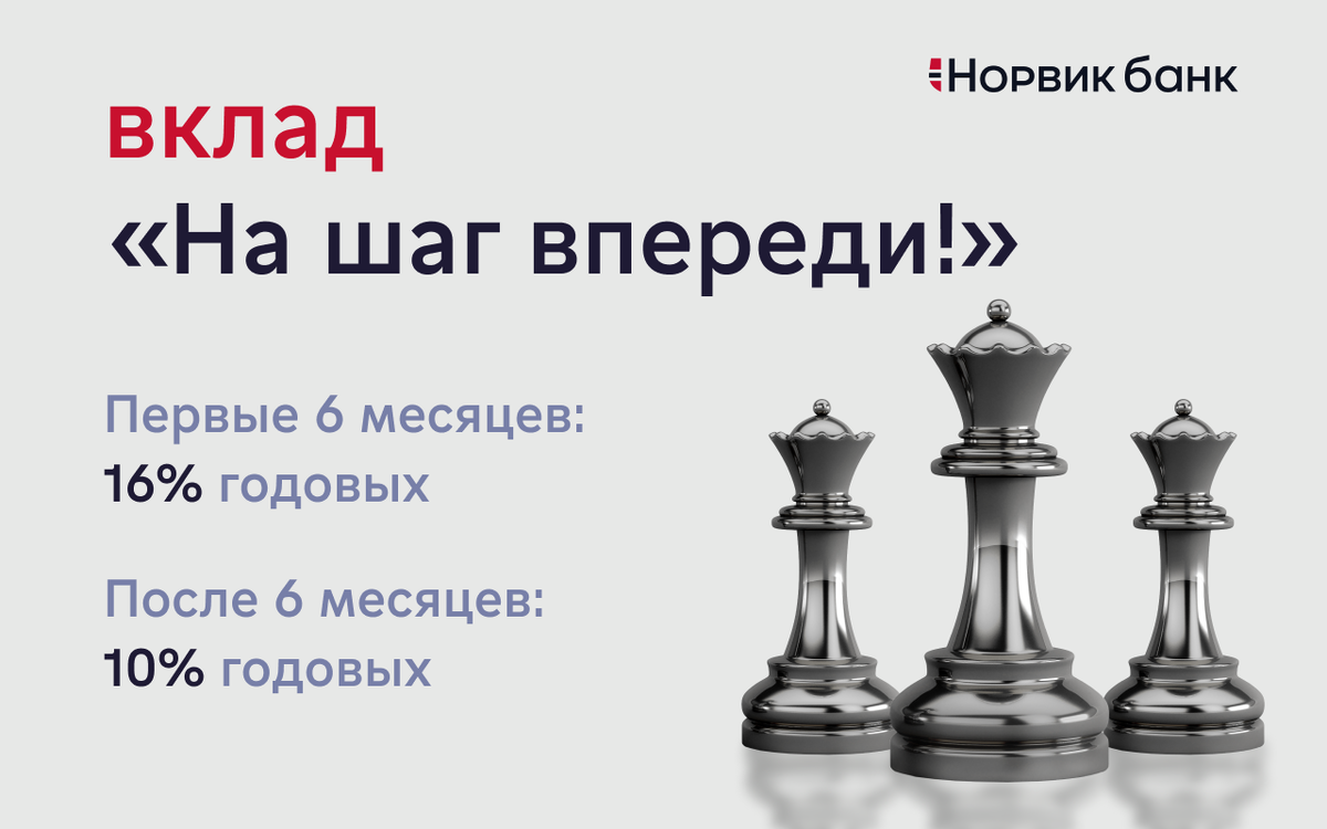 Самое время задуматься о том, как с пользой разместить деньги во вклад, пока не слишком поздно. 💡Норвик Банк предлагает умное решение – вклад «На шаг впереди!». Он разработан специально для тех, кто хочет зафиксировать высокий доход от вложений на несколько лет и быть на шаг впереди рынка. ⚙️Условия вклада: • Срок 36 мес. и 1 день с минимальной суммой вложения 350 000 рублей.
