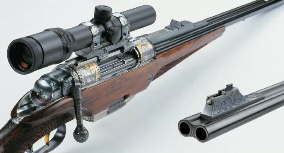 Fuchs - это австрийская компания прославившаяся мощным двуствольным магазинным карабином с продольно скользящим затвором. Сконструировал это необычное оружие канадец венгерского происхождения Joseph Szecsei. По задумке инженера второй выстрел можно сделать практически сразу после первого и быстро перезарядить карабин, работая затвором, как на обычной винтовке. Самой главной отличительной чертой этого карабина, с точки зрения конструкции, является, конечно, затвор. Он поворотный, угол поднятия рукоятки близок 90°, имеет два скреплённых между собой стебля. Соответственно, каждый из них отвечает за запирание своего патронника. Боевые упоры расположены в задней части затвора. Всего их шесть, симметрично по три сверху и снизу. По сути, это два боевых упора, разделённых на три части каждый. Но в этом конкретном случае площадь запирания увеличилась в два раза, по сравнению с «обычной» винтовкой, что позволяет использовать в этом оружии даже самые мощные патроны плоть до .500 NE. В стеблях зат