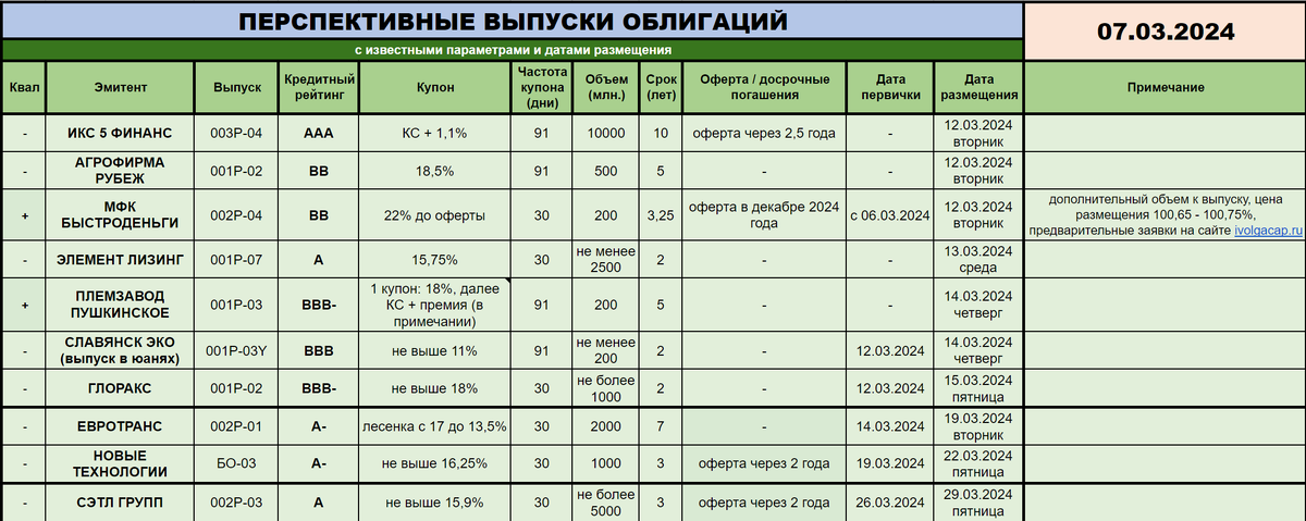 ✌️ Привет, друзья! Предпраздничный день выдался достаточно спокойным, эмитенты и повелители рынка переходят в расслабленный режим, поэтому вестнику достались лишь остатки новостной роскоши. Как они выглядят? Сейчас посмотрим! ---------- 🆕 НОВЫЕ РАЗМЕЩЕНИЯ / АНОНСЫ: 🍃 СЛАВЯНСК ЭКО (🅱️🅱️🅱️) наконец определяется с финальными датами размещения своего выпуска в китайских юанях. Сбор заявок у большинства брокеров уже идет и закончится к обеду 12 марта. А вот торги на бирже начнутся 14 числа - приятно, что затягивать не будут. Напомню параметры - 200 миллионов юаней, 2 года, квартальные выплаты и рекордный для валюты ориентир купона "не выше 11%". На финальную цифру во вторник, безусловно, будет занятно посмотреть :) 🍃 ЭЛЕМЕНТ ЛИЗИНГ (🅰️) удивил - по итогам сбора заявок купонная ставка осталась неизменной! Ориентир "не выше 15,75% превратился в финальные 15,75% без всяких "но". При всем прочем продолжу настаивать на том, что размещение не самое интересное, да и скорая амортизация
