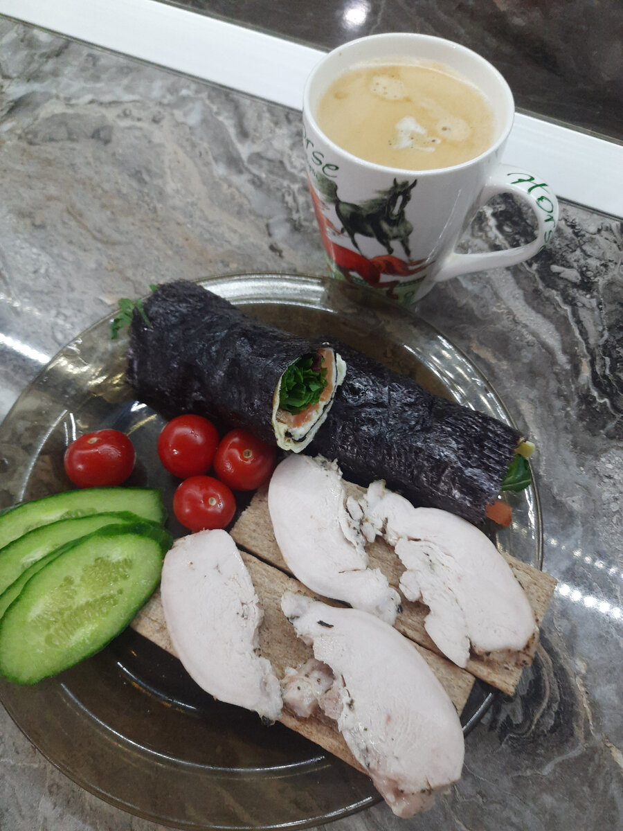 7 марта, четверг. Всем привет 👋. Завтрак. Сегодня из дел небольшая предпраздничная подготовка. Завтра с детьми отметим немного праздник. Испекла Бородинский хлеб. Хочу бутербродов на ржаном хлебе. Отварила язык говяжий, вместо колбасы. Замариновала стейки, завтра только на гриль кину. Испекла сладкий сдобный пирог, отвезем родителям к чаю. Они очень мои пироги любят. Нам сырников напекла и белковых вафель. Обед. Аа, еще вот суп же из форели сварила. В общем, весь день на кухне провела, но с огромным удовольствием. Я вообще люблю готовить и кормить людей. Сегодня с упоением на кухне поработала😁. Ужин. Общая дневная калорийность. Теперь с мужем интересный сериал смотрим, "Месье Спейд". К нам сегодня зима вернулась, на улицу совсем не хочется 😂. Пока 👋.
