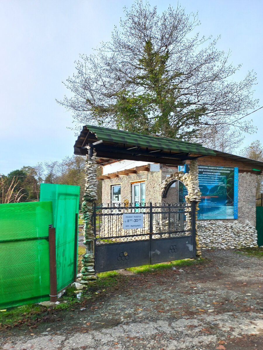 Мы собрались на горячий источник Кындыг, и в тот раз поехали не на маршрутке, а с Артуром, водителем, услугами которого мы неоднократно пользовались. По дороге в Кындыг он нас сначала завез в Сухумский аэропорт, который находится в селе Бабушары, я о нем уже писала. А потом привез нас на термальный источник. Но не в Кындыг – тоже в Бабушарах. Мы слышали о нем, нам говорили, что это полудикий источник, но никто из нас ранее не был, и побывать было интересно. И действительно, оказалось достаточно интересно. Мы подъехали к небольшому каменному домику – так скажем, «административному зданию» источников. Сами источники находились за оградой, начинающейся от этого здания. На здании висит большой стенд с информацией об источнике, указано расписание работы. Все довольно солидно – не завалюшка какая-нибудь. Правда, ни в домике, ни на территории, ни рядом никого не было. Походили вокруг, толкнули калитку – оказалась незапертой. Территория источника имела вид довольно необычный. И не только пот