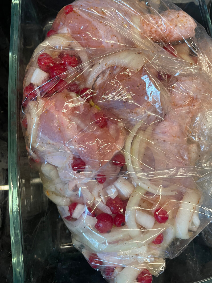 Очень давно не выкладывала рецептов. Отвыкла. И вот в очередной раз готовя куриные ножки с клюквой я вроде принялась фотографировать, еще подумала «надо не забыть готовое снять» … И забыла! Вот вообще забыла. Не только то, что надо снять готовое, но и вообще о том, что хотела сделать публикацию с рецептом. И вспомнила только сейчас — на третий день😁 Так что простите, дорогие! Фото с готовыми аппетитными куриными ножками, от которых струится пар - сегодня не будет🤷🏻♀️ Тем не менее. КУРИНЫЕ НОЖКИ С КЛЮКВОЙ ЗАПЕЧЕННЫЕ В РУКАВЕ. Готовятся предельно просто. Нужно: Лук нарезать полукольцами, сложить в пакет все ингредиенты, посолить и приправить специями. Зажать свободные края пакета/рукава и потрясти его так, чтобы всё перемешалось. Выпустить по возможности весь воздух и завязать пакет. Положить пакет на противень или форму и отправить в духовку, нагретую до 180 градусов. Печь примерно час. Туда же можно отправить запекаться овощи в фольге, например (у меня муж очень любит све
