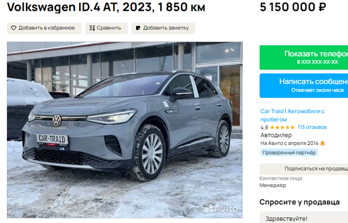 Серенький полноприводный VW ID.4 продаётся уже не первый и не второй месяц. По сравнению с февралём его цена снизилась на 100 тыс. руб. и теперь составляет 5 050 000 руб.