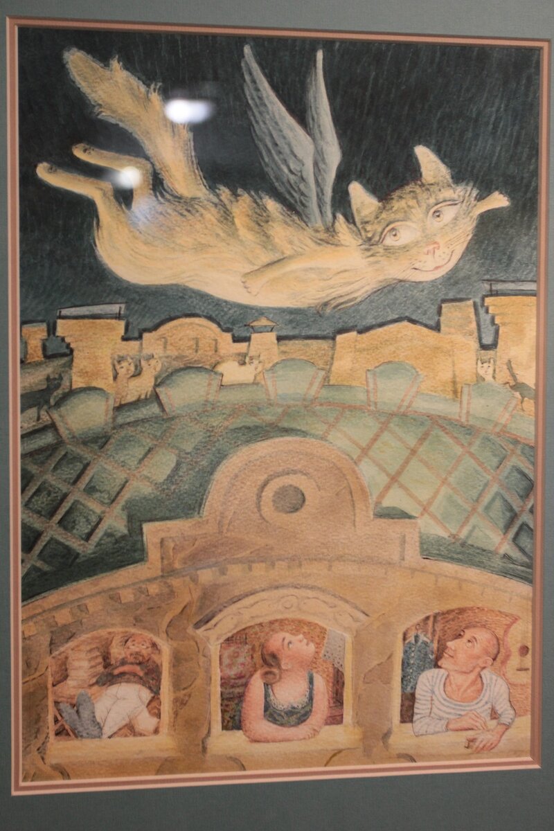 В Калуге отношение к пушистым созданиям очень трепетное, особенно в марте. Сейчас, по традиции, в Доме музыки - время котов. Их здесь много, и они разные. Кошки попали на картины калужских художников, разместились на стенах, на дереве, на заборе и просят «меньше ворчать, больше мурчать». Вячеслав Некрасов «Поют кружевные собаки». Марина Гусева «Адам и Ева» Сплошное «Мяу» Вернисаж выставки «Формула кошки» был абсолютно кошачьим. Вечером на творческую программу КотоСтрофы собрались и дети, и взрослые, и даже собаки, которые вели себя очень культурно, ни разу не подав голоса. Народу было столько, что стулья поставили с двух сторон зала. Калужане шли целыми семьями по три, четыре человека. Звучала музыка, посвященная кошкам в исполнении пианиста Александра Лукашова, песни про кошек и стихи-мяукалки от Маргариты Бендрышевой, а солистки Дома музыки Елена Суяковская и Елена Шумаева под аккомпанемент Виктории Тантлевской промяукали знаменитый шуточный «Кошачий дуэт». Художник Ольга Козлова уст