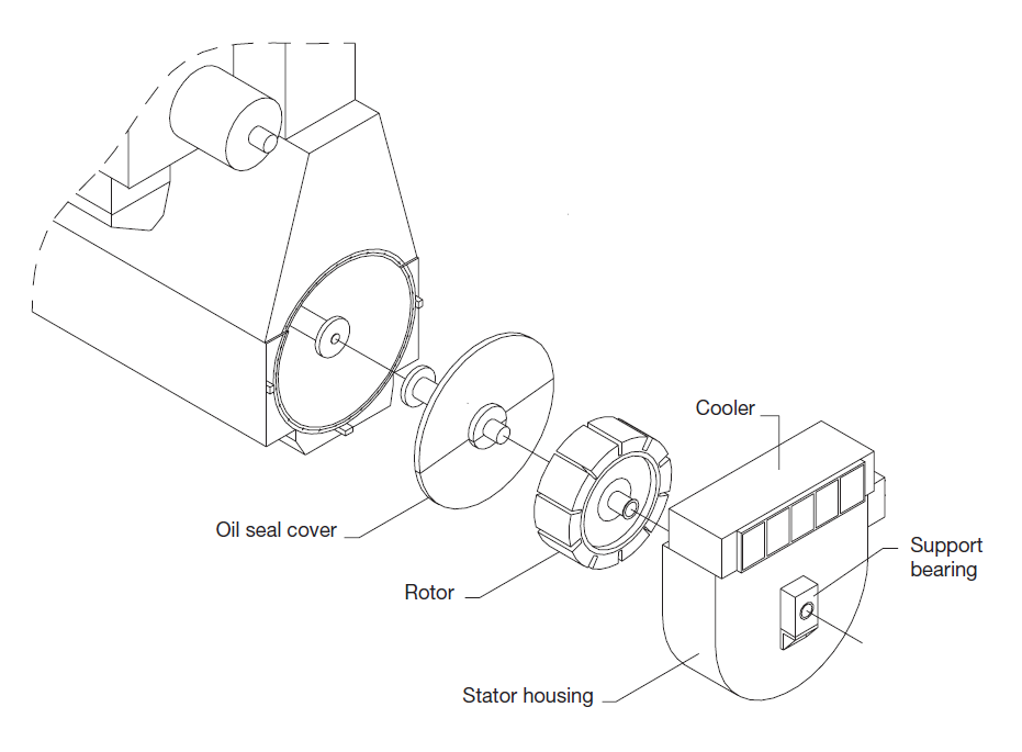 CFE - это чаще всего большой низкооборотный генератор переменного тока, ротор которого установлен непосредственно на коленчатом валу главного двигателя, а корпус статора прикручен болтами к переднему торцу двигателя.