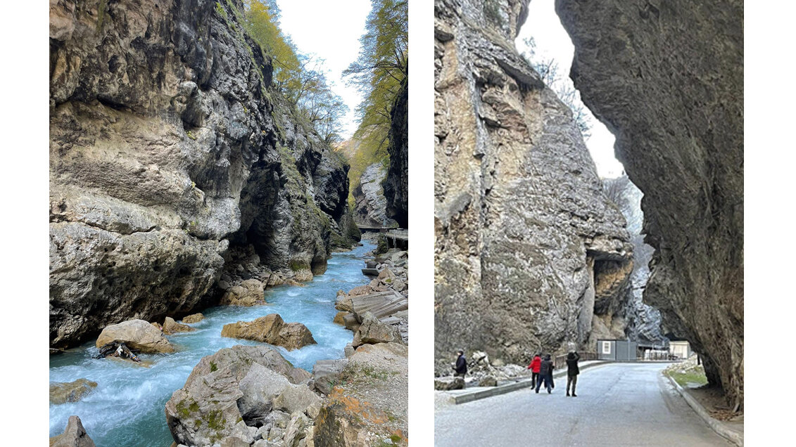 «Сломанная земля» – так переводится слово «Чегем». По легенде, разлом возник от удара копыта коня Чёрного всадника, который промчал по горам на большой скорости. Что не сделало конское копыто, доделала река Чегем, промыв узкое ущелье в известняковых отложениях древних морей. От Нальчика – столицы Кабардино-Балкарии – 35 км до селения Нижний Чегем. С него и начинается "Сломанная земля". Чегемское ущелье переходит в теснину Су-Аузу – «водяное горло»: здесь расстояние между 300-метровыми скалами уменьшается до 20-25 метров. Скалы нависают над головой, образуя каменный мешок. Из скальных стен сочится вода – или срывается вниз шумными потоками. Три Чегемских водопада Адай-Су (девичья коса), или Малый Чегемский водопад. Находится в 2 км к югу от Нижнего Чегема. Это речка Адай-су впадает в реку Чегем, скатываясь по гладкому каменному жёлобу. Высота водопада – 30 м. Сакал-Туп («Седая борода») – ещё один приток Чегема, срывается в реку в теснине Су-Аузу тоже по каменному жёлобу, но другой ф