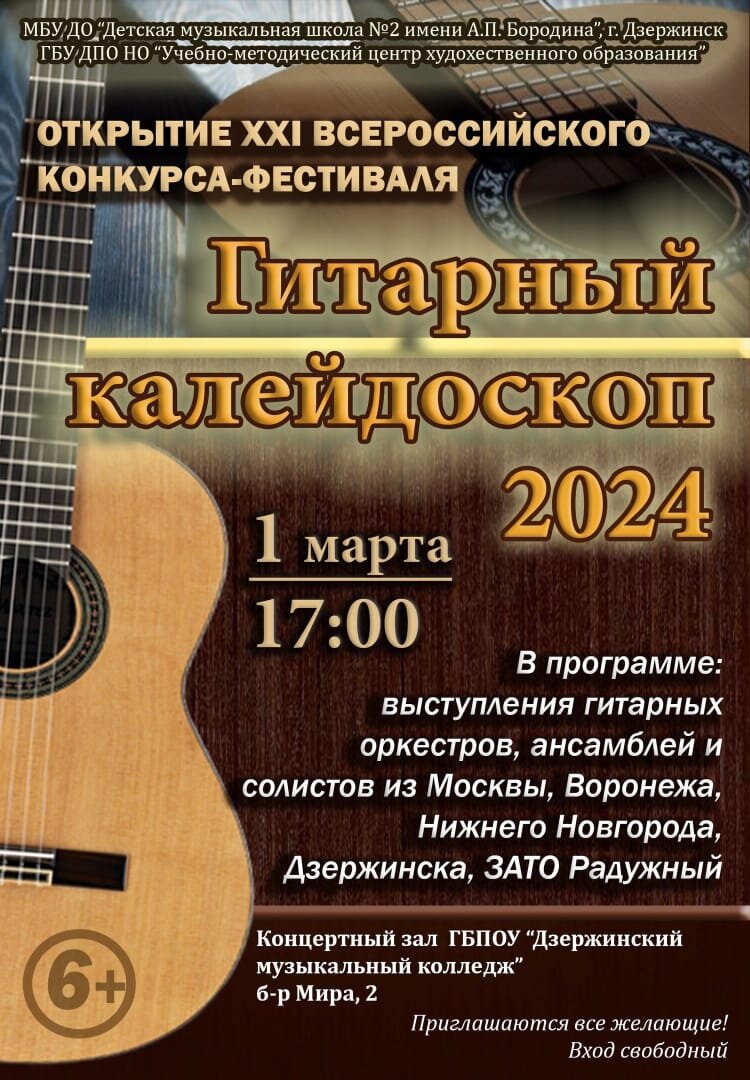 1-2 марта 2024 года в г.Дзержинске Нижегородской области, в МБУ ДО "Детская музыкальная школа №2 им. А.П. Бородина" состоялся XXl Всероссийский конкурс-фестиваль "Гитарный калейдоскоп-2024". В конкурсе приняли участие учащиеся народного отдела МУДО "ВДШИ", СП "ДМШ № 2" Ансамбль гитаристов преподавателя Сергея Анатольевича Федутинова в составе: Архипов Игнат, Щипунов Алексей, Терзи Арсений, Окунев Александр, Мухина Дарья, Алехно Анна и стали Лауреатами I степени! Поздравляем ребят и их преподавателя с очередной победой! Желаем дальнейших успехов!