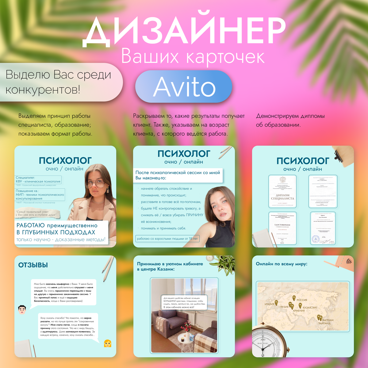 💫Решила Вас обрадовать! Теперь Ваше объявление на Avito будет привлекательным и продающим! Здесь я, также, провожу глубокий анализ конкурентов, изучаю боли потенциальных покупателей / клиентов! И ВЫДЕЛЯЮ ВАС СРЕДИ КОНКУРЕНТОВ! Если Вы продавец на маркетплейсе (Wb, Ozon) / крутой специалист на Авито, и Вам необходим отличный дизайн карточки для Вас - пишите! Выделим Вас / Ваш товар среди конкурентов с помощью качественного анализа и крутого дизайна! Буду рада сотрудничеству! ;) #дизайнер #графическийдизайн #авито #карточкитовара #вб #озон #маркетплейс