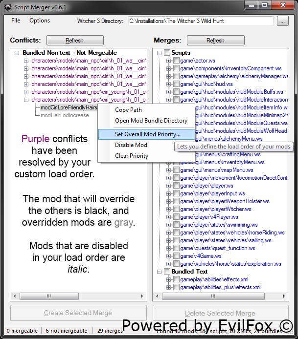 Утилита для обнаружения и исправления конфликтов между модами/скриптами, позволяющая объединить их для правильного исполнения. Рекомендуется использовать совместно с The Witcher 3 Mod Manager.
