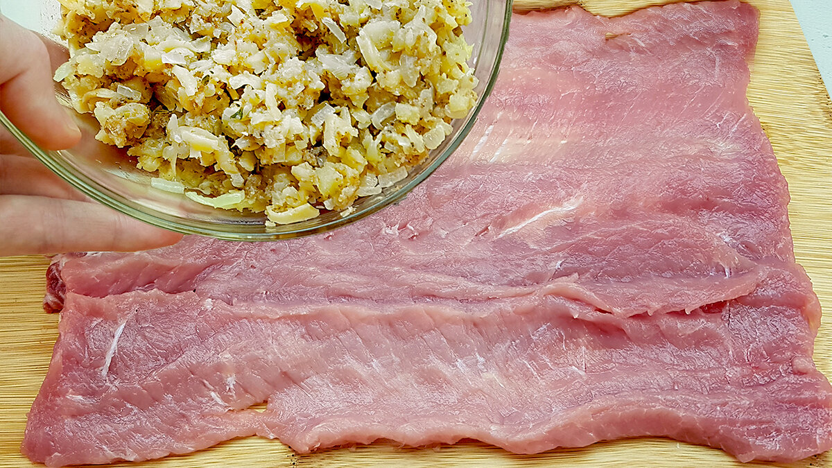 Выложить смесь на мясное "полотно", распределить ровным слоем по поверхности мяса и свернуть в рулет