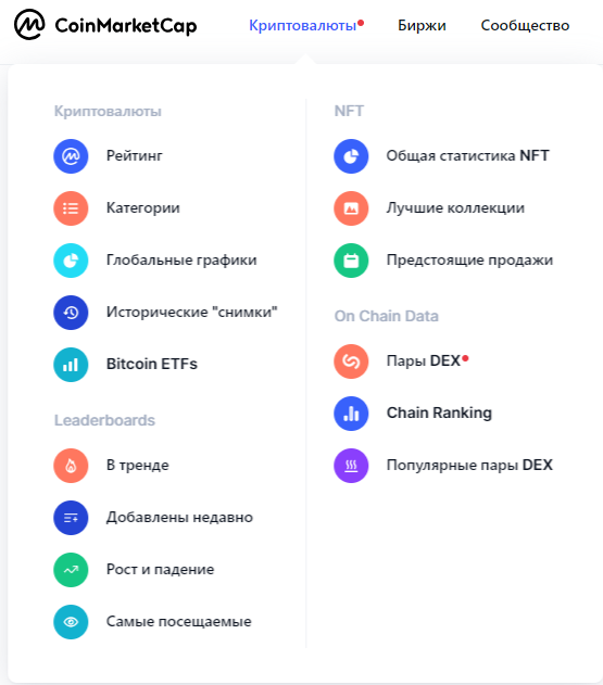В разделе "Криптовалюты" на CoinMarketCap можно найти: