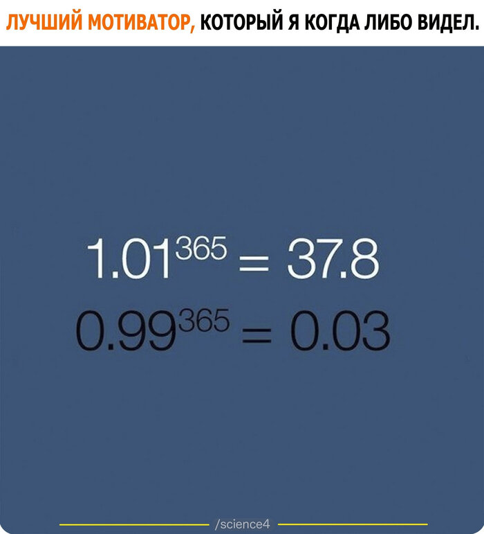 Попалась тут на глаза потрясающая мотивационная картинка, которая должна была меня мотивировать. Однако как и любая мотивация, картинка эта апеллирует исключительно к эмоциям, а не к какой-либо логике. Иначе говоря - фигня полная. В первую очередь, с чего вообще мы что-то делаем с числами 0, 99 и 1, 01? Я понимаю, что эти цифры символизируют вклад сотрудника в работу и подталкивают нас к мысли, что если чуть-чуть недожать, то работы будет сделано очень мало, а если чуть пережать, то прям дофига. Однако следуя этой же логике, если делать ровно столько работы, сколько надо, т.е. 1, то не будет сделано вообще нифига, хоть ты трать на это один день, хоть весь год, хоть всю жизнь. Звучит как-то сомнительно. Второй забавный момент: а с фига ли мы вообще должны возводить эти два числа в степень количества дней? С какой такой логики? Если число это работа/день, а 365 это количество дней, то для получения сделанной за 365 дней работы нужно на эти 365 просто умножить. Получим, соответственно, 0,