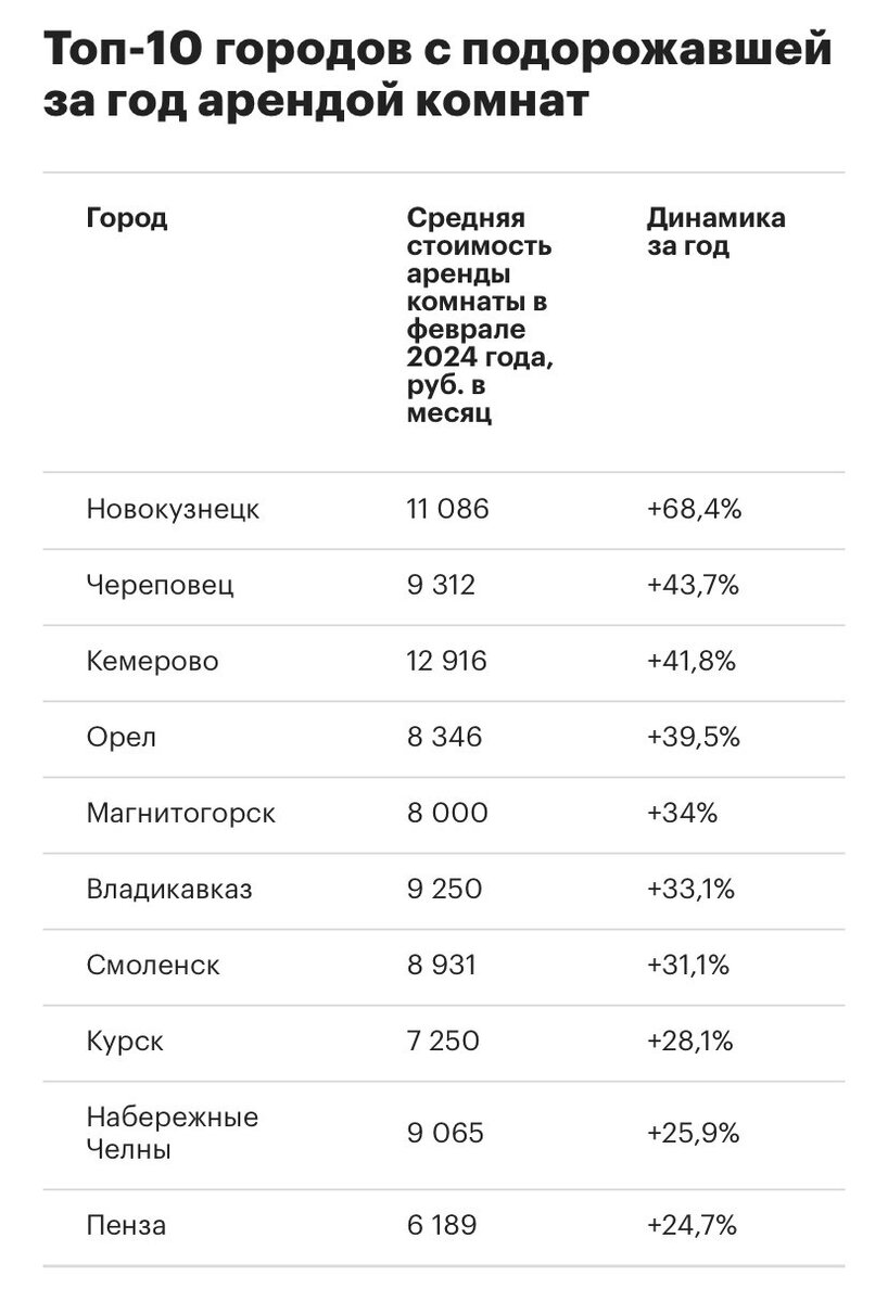 В феврале 2024 года средняя стоимость долгосрочной аренды комнаты в России составила 9,47 тыс. руб. в месяц. Подорожание составило +14,4% к 2023 году. •На первом месте по росту стоимости аренды оказался Новокузнецк с увеличением на 68,4%, достигнув 11,08 тыс. руб. в месяц. •На втором месте расположился Череповец, где арендная плата выросла на 43,7%, достигнув 9,31 тыс. руб. в месяц.