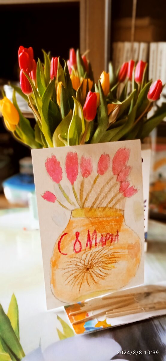 Доброе утро, дорогие Друзья! Прекрасное, праздничное, наполненное нежностью, пусть и затянутое тучами утро! Еще раз хочется поздравить всех дам с праздником! Как началось ваше утро? У меня - с открыток от детей и их тёплых объятий)) Ну конечно поцеловались, пощекотались и завтрак пошли готовить. У нас сегодня прозаично - каша)) Муж подарил кисти для акварели, цветы поставили в вазу ещё вчера, у нас тюльпаны. Но всё никак они не распустятся, боюсь, так и останутся бутончиками. Но всё равно очень красиво! Сразу стало дома уютно и по-весеннему празднично! Пока дети делают уроки, я нашла вот такие замечательные стихи Роберта Рождественского о женщине. "Монолог женщины". Ну как же прекрасно написано! Конечно, это отрывок, стихотворение очень длинное, в нём есть очень интересный сюжет длиною во всю жизнь женщины... Да, мы такие... Загадочные)) Современная женщина, современная женщина! Суетою замотана, но, как прежде божественна! Пусть немного усталая, но, как прежде, прекрасная! До конца неп