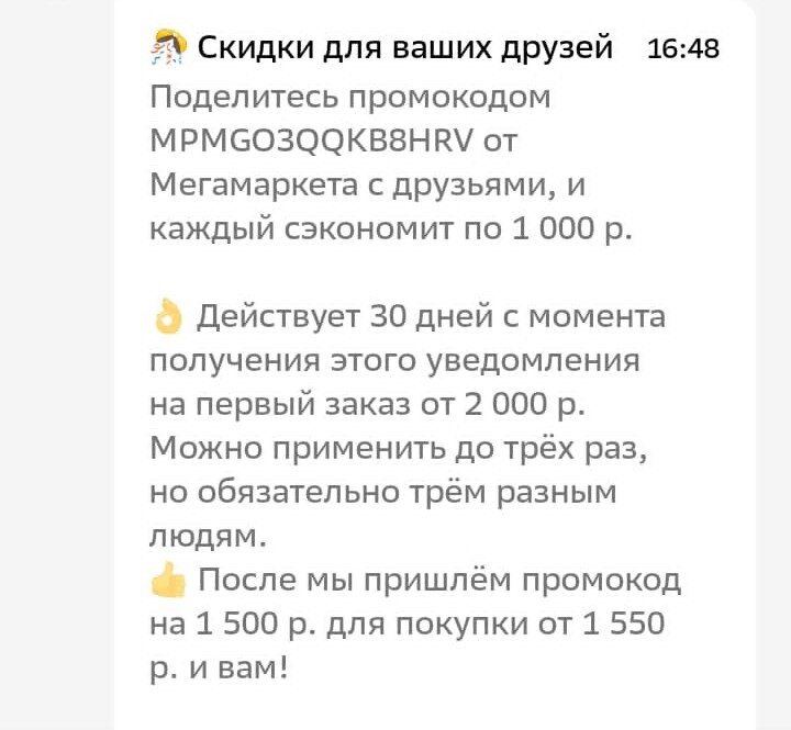 Всем доброго дня и прекрасного настроения, дорогие мои читатели. Вчера мне пришло уведомление от Мегамаркета с промокодом для друзей. Делюсь с вами. Буду рада, если кому-то пригодится и поможет немного сэкономить. А мы же знаем, что любая сумма, которую удалось сохранить – это, считайте, деньги, которые мы заработали. У меня в плане экономии действует следующий принцип. Получилось на чем-то выгадать, потратила меньше, чем планировала – убираю эти деньги в копилку. Меня совершенно не смущает, если речь идет о небольшой сумме – 500 рублей, 200, да даже 100. Из таких мелочей и складываются приличные суммы в перспективе. Смысл предложения от ММ такой: Скидка 1000 рублей на первый заказ от 2000. Можно использовать трем людям. Ну т.е. можно сформировать корзину на 2 тысячи, а заплатить по итогу половину. Отличное предложение, я считаю. Поэтому, если для вас актуально – пользуйтесь на здоровье. Предложение действует 30 дней от момента получения уведомления. Если я правильно посчитала – до 5