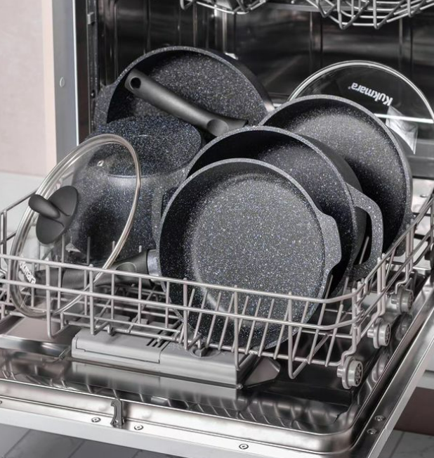 В посудомоечной машине не рекомендуется мыть чугунную посуду и алюминиевые изделия без покрытия. Алюминий боится воздействия щелочной среды. После мытья в посудомойке он потеряет свой блеск – на поверхности разрушится оксидная пленка и образуется серый налет. Посуда из чугуна при долгом нахождении в посудомойке может заржаветь. После первой мойки скорей всего ничего страшного не произойдет, но уже после нескольких на чугунной посуде образуется коррозия. Также купание в посудомойке противопоказано деревянным разделочным доскам и ложкам, кухонным ножам и другим острым предметам, тонкому фарфору и хрусталю, посуде с рисунками и металлическим напылением. Для стеклянных стаканов и бокалов выбирайте программу со сниженной температурой. Пластик выдерживает нагрев до 60–70 градусов. С кухонными комбайнами и прочей подобной техникой обращаться согласно инструкции. А что с антипригарной посудой, ее можно загружать в посудомойку? Посуду с антипригарным покрытием мыть в посудомоечной машине не рек